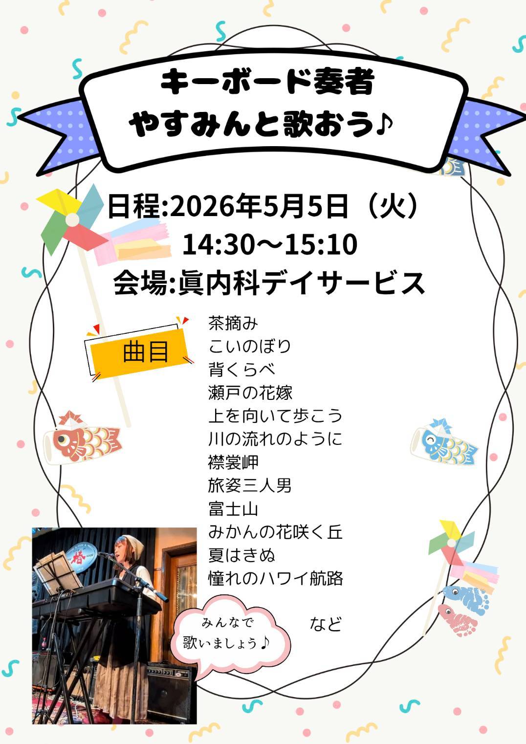 5月5日(火)14:30〜15:10 昨年10月に歌のボランティアに来ていただき大好評だった キーボード奏者やすみんさんが 再び眞内科デイサービスに来て下さいます! 5月の風のようなさわやかな 初夏の懐かしい歌や 昭和歌謡を みなさん一緒に歌いましょう!